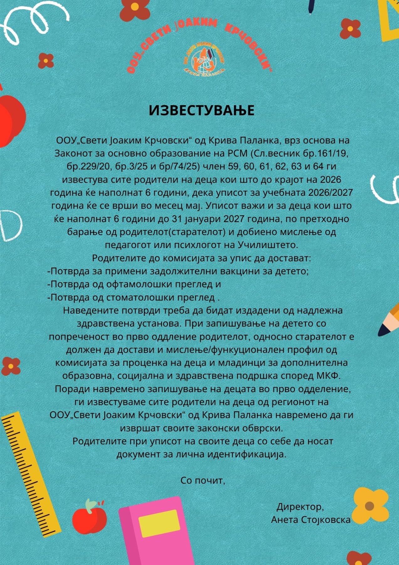 • 📝ИЗВЕСТУВЊЕ 📚за запишување на ученици во прво одделение во учебната 2026/2027 година 📖