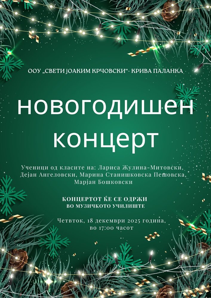 , на 18 декември 2025 година (четврток) со почеток во 17:00 часот, во ООУ „Свети Јоаким Крчовски“-Крива Паланка успешно се реализираше Новогодишниот концерт.![]()